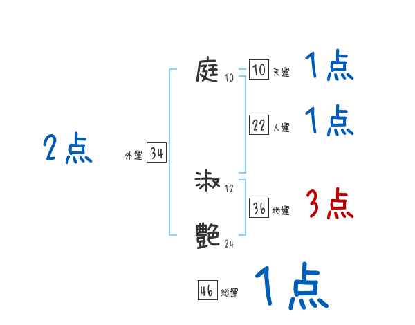 総運![]() | 庭淑艶さんの総運は46画の1つ星!迷走することが多く苦労するかも。目先のことにとらわれないように。 あなたの人生を表す1番重要な運勢です。生涯を通じて影響する総合運となり、主に50歳以降の晩年期に影響を及ぼします。 |