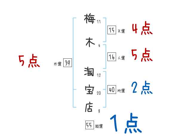 人運![]() | 梅木淘宝店さんの人運は16画の5つ星!人望が厚く大きく発展する。逆転成功が見える。 性格や才能などを表す2番目に重要な運勢です。人間関係や協調性、社会的な成功に影響します。主に20歳から50歳ぐらいまでの中年期の運勢を表します。 |