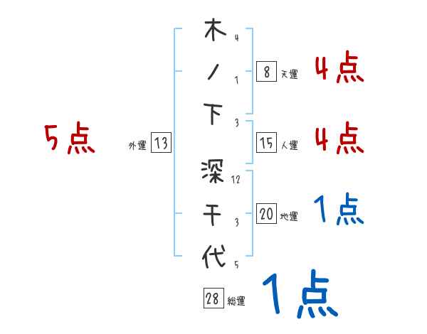 総運![]() | 木ノ下深千代さんの総運は28画の1つ星!家庭環境に注意。スポーツで活躍できる能力があるかも。 あなたの人生を表す1番重要な運勢です。生涯を通じて影響する総合運となり、主に50歳以降の晩年期に影響を及ぼします。 |