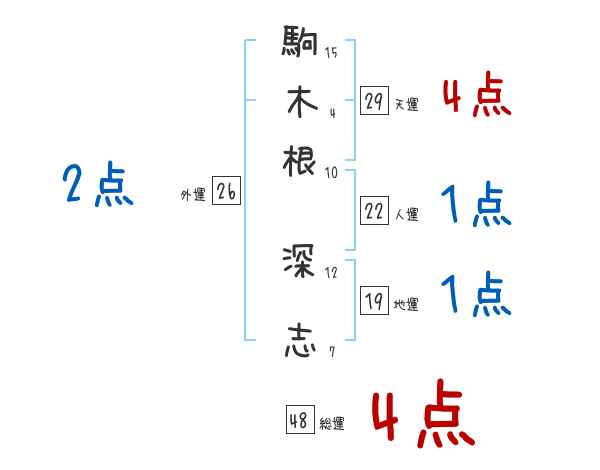 天運![]() | 駒木根深志さんの天運は29画の4つ星!完全主義で才能がある。厳格な心の持ち主。 家系が持つ宿命的な運勢を表します。祖先から受け継いだ苗字ですので自分の力が及びません。家柄を象徴します。 |