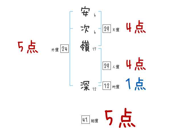 人運![]() | 安次嶺深さんの人運は29画の4つ星!完全主義で才能がある。厳格な心の持ち主。 性格や才能などを表す2番目に重要な運勢です。人間関係や協調性、社会的な成功に影響します。主に20歳から50歳ぐらいまでの中年期の運勢を表します。 |