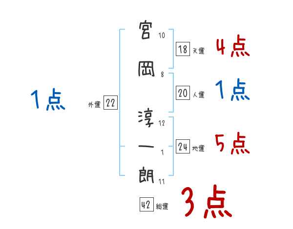 外運![]() | 宮岡淳一朗さんの外運は22画の1つ星!努力することが苦手ないっぽう手先が器用。芸術性にも優れる。 生活面を象徴する運勢です。外部から受ける影響力を表し、結婚運、家庭運や職場、環境への順応性を表します。 |