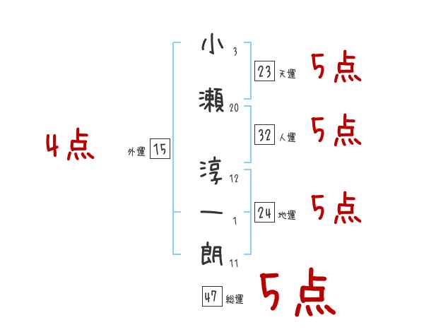 総運![]() | 小瀬淳一朗さんの総運は47画の5つ星!実力が開花し発展する円満な人生。財に恵まれる。 あなたの人生を表す1番重要な運勢です。生涯を通じて影響する総合運となり、主に50歳以降の晩年期に影響を及ぼします。 |