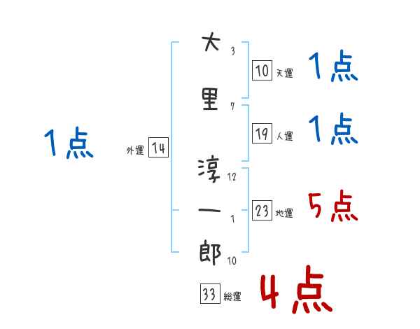 外運![]() | 大里淳一郎さんの外運は14画の1つ星!人に対して優しいがストレスを溜め込みがち。人間関係のトラブルを避けるよう気をつけましょう。 生活面を象徴する運勢です。外部から受ける影響力を表し、結婚運、家庭運や職場、環境への順応性を表します。 |
