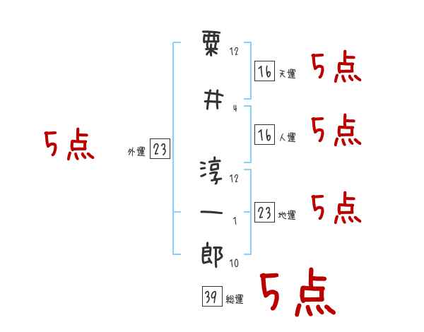 天運![]() | 粟井淳一郎さんの天運は16画の5つ星!人望が厚く大きく発展する。逆転成功が見える。 家系が持つ宿命的な運勢を表します。祖先から受け継いだ苗字ですので自分の力が及びません。家柄を象徴します。 |