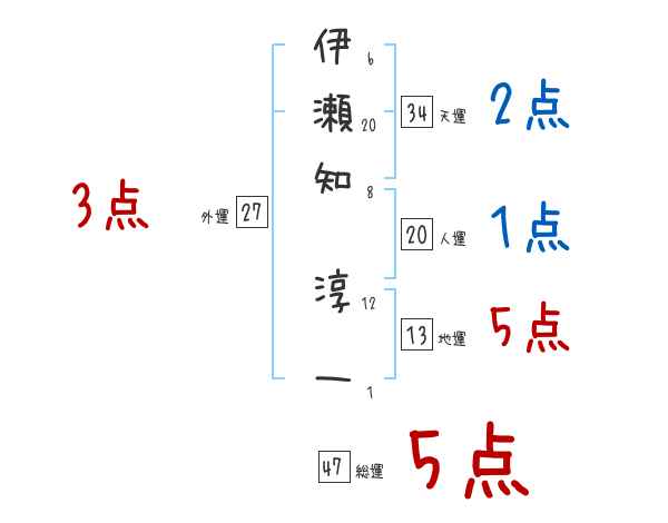 総運![]() | 伊瀬知淳一さんの総運は47画の5つ星!実力が開花し発展する円満な人生。財に恵まれる。 あなたの人生を表す1番重要な運勢です。生涯を通じて影響する総合運となり、主に50歳以降の晩年期に影響を及ぼします。 |