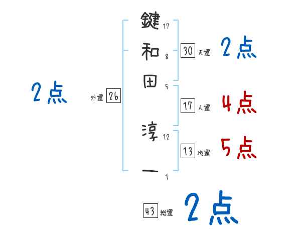 天運![]() | 鍵和田淳一さんの天運は30画の2つ星!浮き沈みの激しさに注意しましょう。 家系が持つ宿命的な運勢を表します。祖先から受け継いだ苗字ですので自分の力が及びません。家柄を象徴します。 |