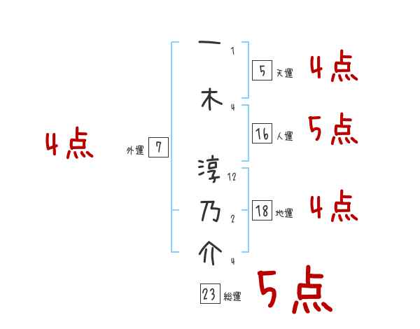人運![]() | 一木淳乃介さんの人運は16画の5つ星!人望が厚く大きく発展する。逆転成功が見える。 性格や才能などを表す2番目に重要な運勢です。人間関係や協調性、社会的な成功に影響します。主に20歳から50歳ぐらいまでの中年期の運勢を表します。 |