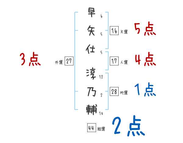 天運![]() | 早矢仕淳乃輔さんの天運は16画の5つ星!人望が厚く大きく発展する。逆転成功が見える。 家系が持つ宿命的な運勢を表します。祖先から受け継いだ苗字ですので自分の力が及びません。家柄を象徴します。 |