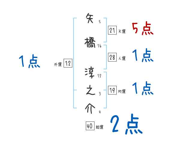 天運![]() | 矢橋淳之介さんの天運は21画の5つ星!統率力がある。独立し成功する。名誉を手に入れる。 家系が持つ宿命的な運勢を表します。祖先から受け継いだ苗字ですので自分の力が及びません。家柄を象徴します。 |
