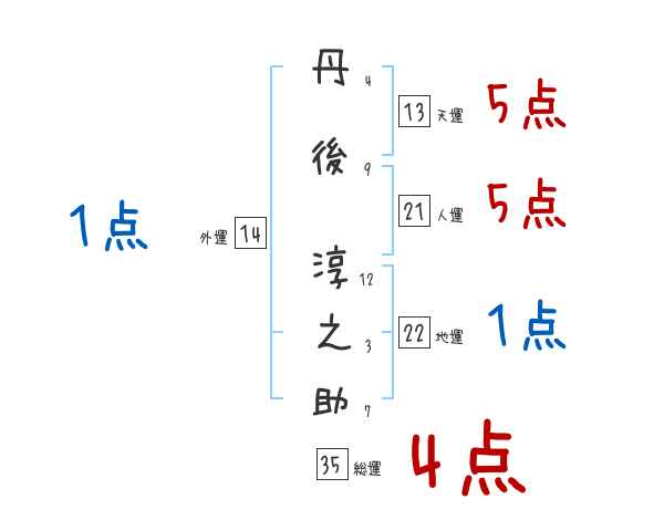 天運![]() | 丹後淳之助さんの天運は13画の5つ星!才能に恵まれ人気がある。名声を手に入れる。円満な人生。 家系が持つ宿命的な運勢を表します。祖先から受け継いだ苗字ですので自分の力が及びません。家柄を象徴します。 |