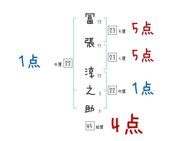 天運![]() | 冨張淳之助さんの天運は23画の5つ星!想像力に優れ活力がある。一代で成功し名誉を手に入れる。 家系が持つ宿命的な運勢を表します。祖先から受け継いだ苗字ですので自分の力が及びません。家柄を象徴します。 |