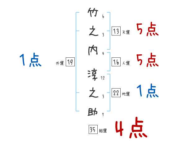 人運![]() | 竹之内淳之助さんの人運は16画の5つ星!人望が厚く大きく発展する。逆転成功が見える。 性格や才能などを表す2番目に重要な運勢です。人間関係や協調性、社会的な成功に影響します。主に20歳から50歳ぐらいまでの中年期の運勢を表します。 |