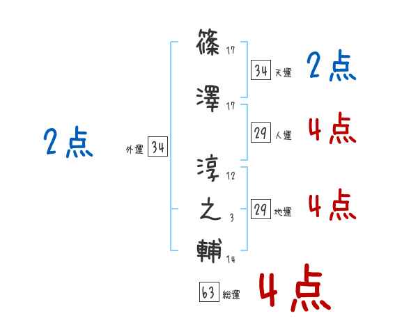 天運![]() | 篠澤淳之輔さんの天運は34画の2つ星!独創性に優れるが、自尊心が強く災難に注意しましょう。 家系が持つ宿命的な運勢を表します。祖先から受け継いだ苗字ですので自分の力が及びません。家柄を象徴します。 |