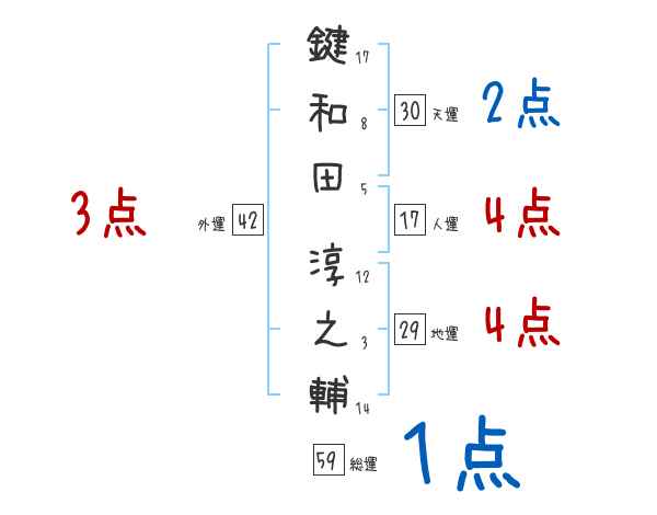 総運![]() | 鍵和田淳之輔さんの総運は59画の1つ星!意志の弱さであきらめることが多いかも。粘り強さが必要。 あなたの人生を表す1番重要な運勢です。生涯を通じて影響する総合運となり、主に50歳以降の晩年期に影響を及ぼします。 |