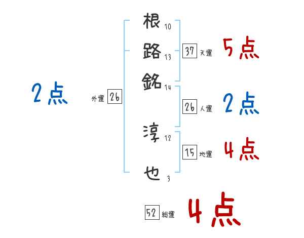 総運![]() | 根路銘淳也さんの総運は52画の4つ星!先見性と独創性に優れ考える力がある。強運の持ち主。 あなたの人生を表す1番重要な運勢です。生涯を通じて影響する総合運となり、主に50歳以降の晩年期に影響を及ぼします。 |