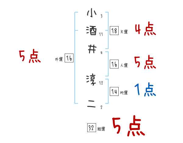 外運![]() | 小酒井淳二さんの外運は16画の5つ星!人望が厚く大きく発展する。逆転成功が見える。 生活面を象徴する運勢です。外部から受ける影響力を表し、結婚運、家庭運や職場、環境への順応性を表します。 |