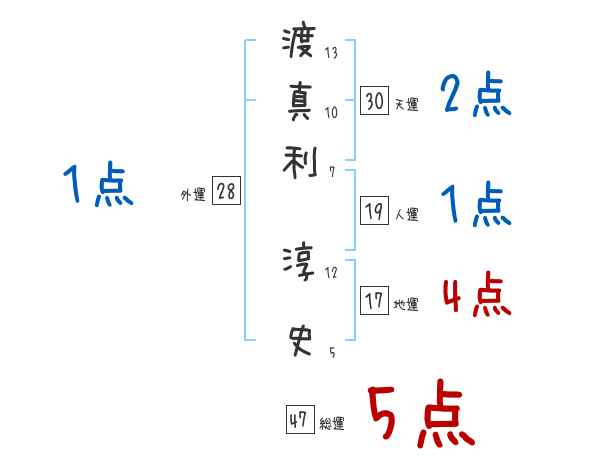 天運![]() | 渡真利淳史さんの天運は30画の2つ星!浮き沈みの激しさに注意しましょう。 家系が持つ宿命的な運勢を表します。祖先から受け継いだ苗字ですので自分の力が及びません。家柄を象徴します。 |