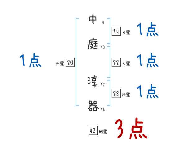 天運![]() | 中庭淳器さんの天運は14画の1つ星!人に対して優しいがストレスを溜め込みがち。人間関係のトラブルを避けるよう気をつけましょう。 家系が持つ宿命的な運勢を表します。祖先から受け継いだ苗字ですので自分の力が及びません。家柄を象徴します。 |