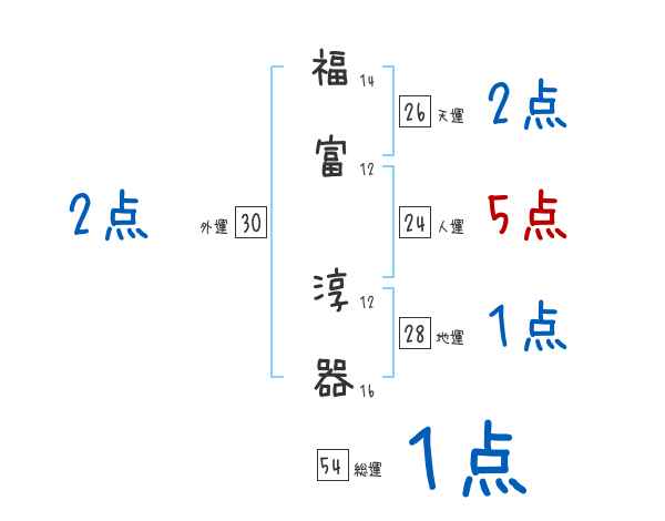 天運![]() | 福富淳器さんの天運は26画の2つ星!波瀾万丈かも。信頼できる人を大事にしましょう。 家系が持つ宿命的な運勢を表します。祖先から受け継いだ苗字ですので自分の力が及びません。家柄を象徴します。 |