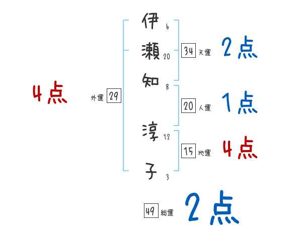 外運![]() | 伊瀬知淳子さんの外運は29画の4つ星!完全主義で才能がある。厳格な心の持ち主。 生活面を象徴する運勢です。外部から受ける影響力を表し、結婚運、家庭運や職場、環境への順応性を表します。 |