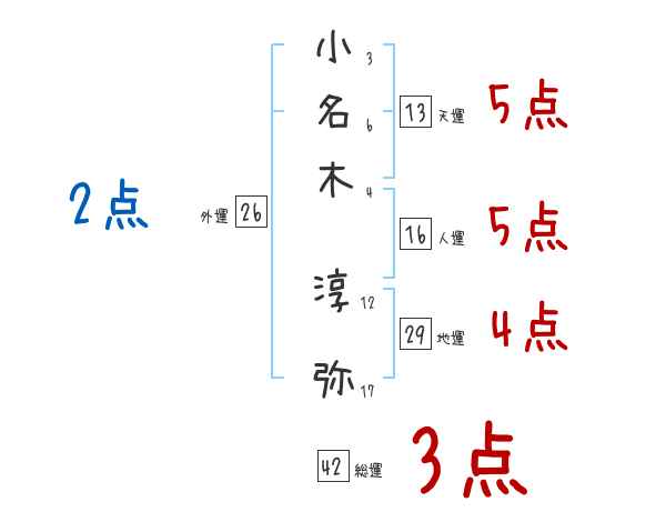 総運![]() | 小名木淳弥さんの総運は42画の3つ星!病気に注意。多芸であるが消極的でおとなしい。 あなたの人生を表す1番重要な運勢です。生涯を通じて影響する総合運となり、主に50歳以降の晩年期に影響を及ぼします。 |