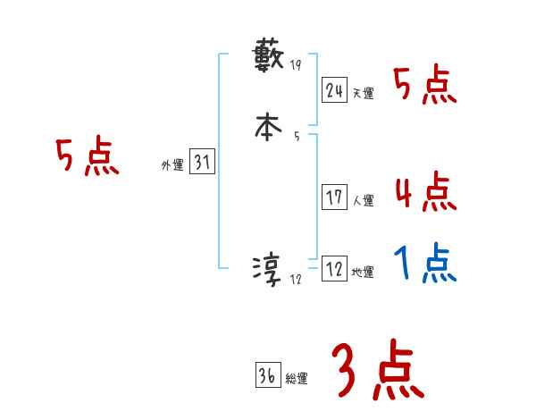 総運![]() | 藪本淳さんの総運は36画の3つ星!先見性が豊かです。多少神経質で苦労することも。 あなたの人生を表す1番重要な運勢です。生涯を通じて影響する総合運となり、主に50歳以降の晩年期に影響を及ぼします。 |