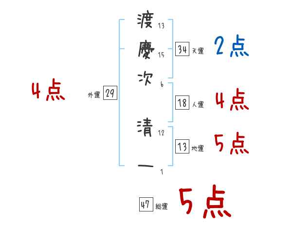 外運![]() | 渡慶次清一さんの外運は29画の4つ星!完全主義で才能がある。厳格な心の持ち主。 生活面を象徴する運勢です。外部から受ける影響力を表し、結婚運、家庭運や職場、環境への順応性を表します。 |