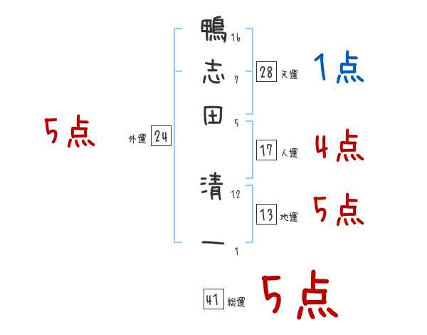 外運![]() | 鴨志田清一さんの外運は24画の5つ星!家庭運が良く順調な人生。金運にも恵まれる。 生活面を象徴する運勢です。外部から受ける影響力を表し、結婚運、家庭運や職場、環境への順応性を表します。 |
