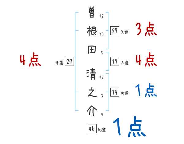 総運![]() | 曽根田清之介さんの総運は46画の1つ星!迷走することが多く苦労するかも。目先のことにとらわれないように。 あなたの人生を表す1番重要な運勢です。生涯を通じて影響する総合運となり、主に50歳以降の晩年期に影響を及ぼします。 |