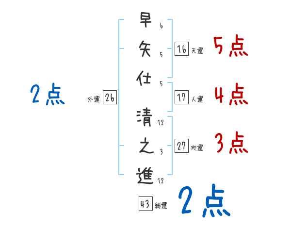 天運![]() | 早矢仕清之進さんの天運は16画の5つ星!人望が厚く大きく発展する。逆転成功が見える。 家系が持つ宿命的な運勢を表します。祖先から受け継いだ苗字ですので自分の力が及びません。家柄を象徴します。 |