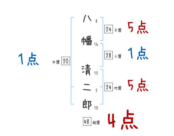 天運![]() | 八幡清二郎さんの天運は24画の5つ星!家庭運が良く順調な人生。金運にも恵まれる。 家系が持つ宿命的な運勢を表します。祖先から受け継いだ苗字ですので自分の力が及びません。家柄を象徴します。 |