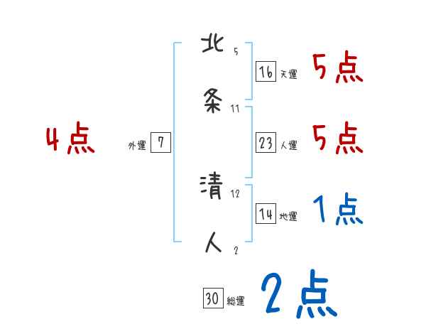 天運![]() | 北条清人さんの天運は16画の5つ星!人望が厚く大きく発展する。逆転成功が見える。 家系が持つ宿命的な運勢を表します。祖先から受け継いだ苗字ですので自分の力が及びません。家柄を象徴します。 |