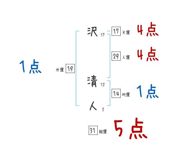 天運![]() | 沢清人さんの天運は17画の4つ星!積極的な行動力。地位を気づき財産を手に入れる。純粋な心と直感力。 家系が持つ宿命的な運勢を表します。祖先から受け継いだ苗字ですので自分の力が及びません。家柄を象徴します。 |