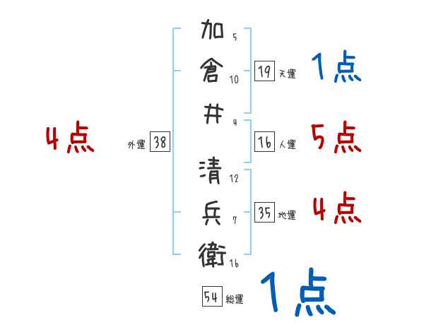 人運![]() | 加倉井清兵衛さんの人運は16画の5つ星!人望が厚く大きく発展する。逆転成功が見える。 性格や才能などを表す2番目に重要な運勢です。人間関係や協調性、社会的な成功に影響します。主に20歳から50歳ぐらいまでの中年期の運勢を表します。 |