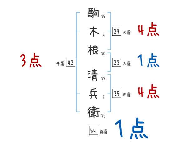 天運![]() | 駒木根清兵衛さんの天運は29画の4つ星!完全主義で才能がある。厳格な心の持ち主。 家系が持つ宿命的な運勢を表します。祖先から受け継いだ苗字ですので自分の力が及びません。家柄を象徴します。 |