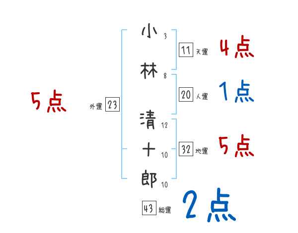 天運![]() | 小林清十郎さんの天運は11画の4つ星!着実に富や地位を得る幸運な人生。 家系が持つ宿命的な運勢を表します。祖先から受け継いだ苗字ですので自分の力が及びません。家柄を象徴します。 |