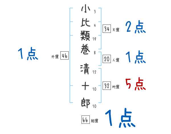 地運![]() | 小比類巻清十郎さんの地運は32画の5つ星!柔軟性があり成功する。チャンスが多く金運が良い。 個性を表す基礎的な運勢です。性格形成や対人関係、行動力など家庭環境に影響されます。主に誕生してから20歳くらいまでの若年期の運勢を表します。 |