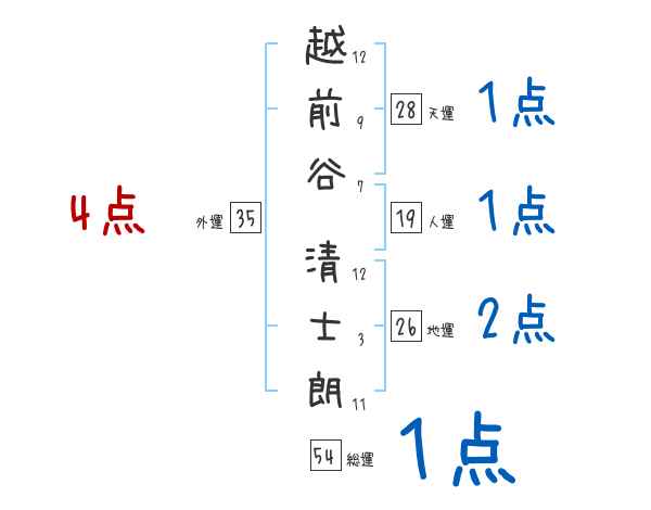 天運![]() | 越前谷清士朗さんの天運は28画の1つ星!家庭環境に注意。スポーツで活躍できる能力があるかも。 家系が持つ宿命的な運勢を表します。祖先から受け継いだ苗字ですので自分の力が及びません。家柄を象徴します。 |
