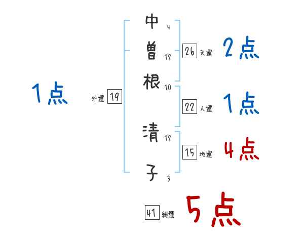 天運![]() | 中曽根清子さんの天運は26画の2つ星!波瀾万丈かも。信頼できる人を大事にしましょう。 家系が持つ宿命的な運勢を表します。祖先から受け継いだ苗字ですので自分の力が及びません。家柄を象徴します。 |