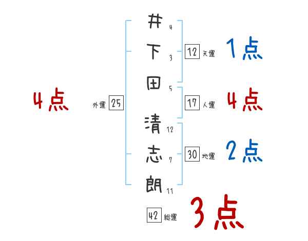 総運![]() | 井下田清志朗さんの総運は42画の3つ星!病気に注意。多芸であるが消極的でおとなしい。 あなたの人生を表す1番重要な運勢です。生涯を通じて影響する総合運となり、主に50歳以降の晩年期に影響を及ぼします。 |