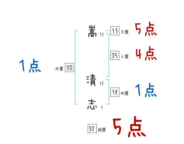 総運![]() | 嵩清志さんの総運は32画の5つ星!柔軟性があり成功する。チャンスが多く金運が良い。 あなたの人生を表す1番重要な運勢です。生涯を通じて影響する総合運となり、主に50歳以降の晩年期に影響を及ぼします。 |