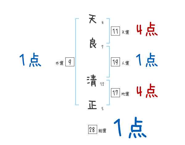 天運![]() | 天良清正さんの天運は11画の4つ星!着実に富や地位を得る幸運な人生。 家系が持つ宿命的な運勢を表します。祖先から受け継いだ苗字ですので自分の力が及びません。家柄を象徴します。 |
