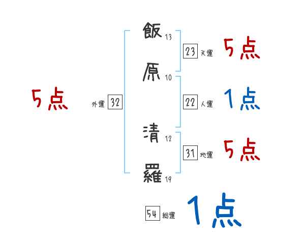 外運![]() | 飯原清羅さんの外運は32画の5つ星!柔軟性があり成功する。チャンスが多く金運が良い。 生活面を象徴する運勢です。外部から受ける影響力を表し、結婚運、家庭運や職場、環境への順応性を表します。 |