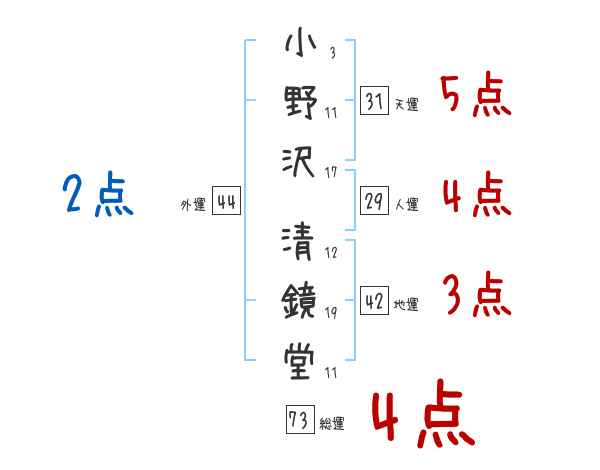 総運![]() | 小野沢清鏡堂さんの総運は73画の4つ星!天徳のある人生。散財に注意すれば晩年幸福。 あなたの人生を表す1番重要な運勢です。生涯を通じて影響する総合運となり、主に50歳以降の晩年期に影響を及ぼします。 |