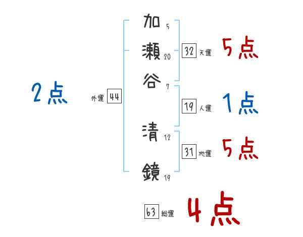天運![]() | 加瀬谷清鏡さんの天運は32画の5つ星!柔軟性があり成功する。チャンスが多く金運が良い。 家系が持つ宿命的な運勢を表します。祖先から受け継いだ苗字ですので自分の力が及びません。家柄を象徴します。 |