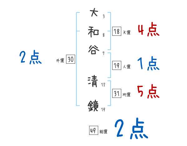 地運![]() | 大和谷清鏡さんの地運は31画の5つ星!社交性があり判断力に優れる。順風満帆な人生で円満な生活。 個性を表す基礎的な運勢です。性格形成や対人関係、行動力など家庭環境に影響されます。主に誕生してから20歳くらいまでの若年期の運勢を表します。 |