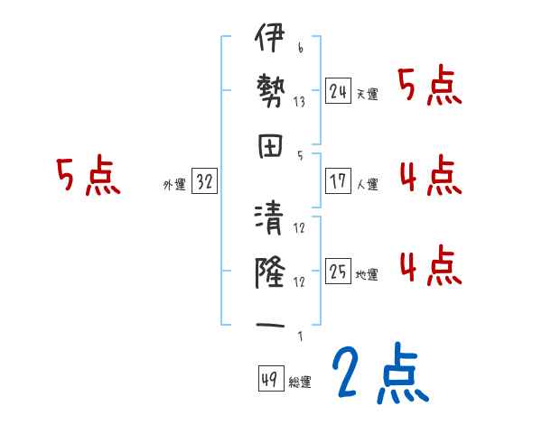 伊勢田清隆一さんの画数の鑑定結果