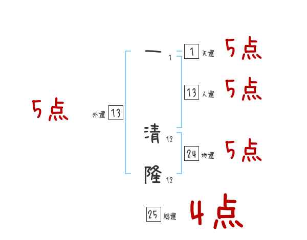 天運![]() | 一清隆さんの天運は1画の5つ星!行動力、指導力があり出世し繁栄する。幸運に恵まれる。 家系が持つ宿命的な運勢を表します。祖先から受け継いだ苗字ですので自分の力が及びません。家柄を象徴します。 |