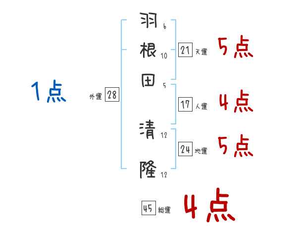 総運![]() | 羽根田清隆さんの総運は45画の4つ星!もくもくと物事を進め達成する。地味な努力家。 あなたの人生を表す1番重要な運勢です。生涯を通じて影響する総合運となり、主に50歳以降の晩年期に影響を及ぼします。 |